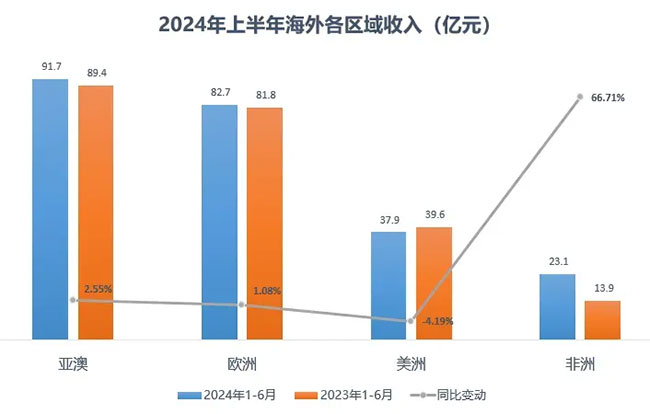 2024年上半年,公司海外收入持续增长,主营业务实现海外销售收入235.42亿元,同比增长4.79%,海外收入占主营业务收入比重达62.23%。