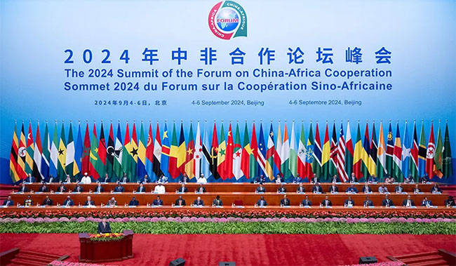 2024年9月5日上午,2024年中非合作论坛北京峰会在人民大会堂隆重开幕。中国国家主席习近平出席开幕式并发表主旨讲话。习近平宣布,中国同所有非洲建交国的双边关系提升到战略关系层面,中非关系整体定位提升至新时代全天候中非命运共同体,将实施中非携手推进现代化十大伙伴行动。