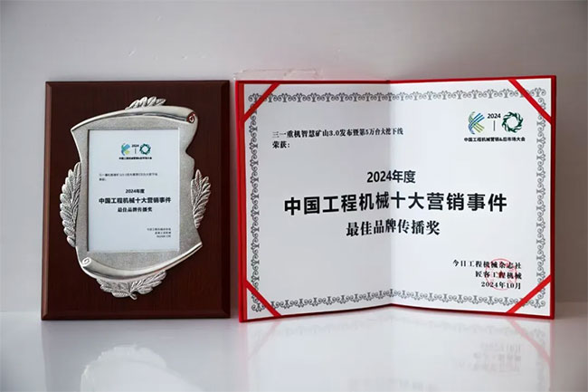 会议期间,2024年度中国工程机械十大营销事件震撼发布,《三一重机智慧矿山3.0发布暨第5万台大挖下线》获评“2024年度中国工程机械十大营销事件”最佳品牌传播奖。