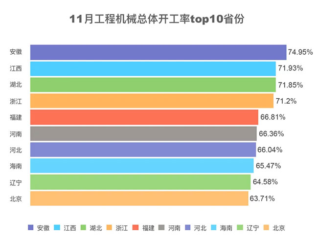 11月份,存量政策与增量政策效果持续显现,带动市场供需两端向好运行,基础民生工程入冬后仍火热推进。11月份,全国工程机械开工率为51.72%。综合开工率排名前十的省份分别是:安徽、江西、湖北、浙江、福建、河南、河北、海南、辽宁、北京,11月全国有12个省份的综合开工率当月实现环比增长。