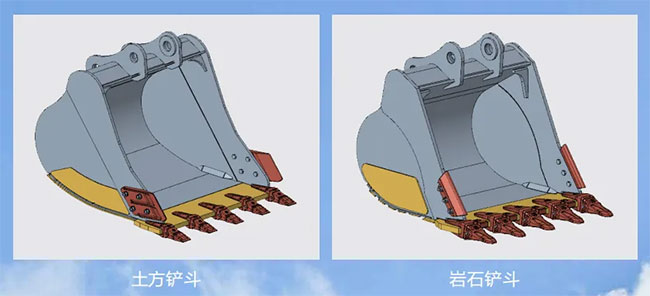 标配土方铲斗,可选配岩石铲斗,实现“一况一斗”,满足不同工况作业需求。铲斗斗型优化,挖掘过程平均阻力降低5%,效率提高约10%,挖掘更顺畅。
