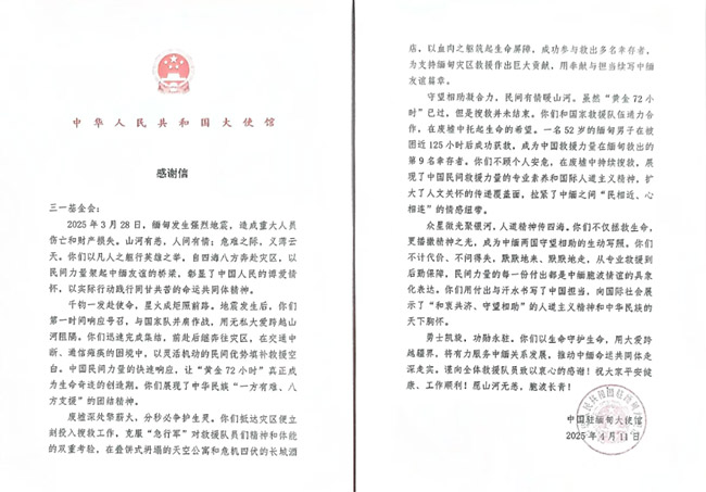 近日,中国驻缅甸大使馆向三一发来感谢信,高度认可三一基金会在缅甸地震后的救援行动。信中指出,三一 “第一时间响应号召,与国家队并肩作战,以无私大爱跨越山河阻隔”,并表扬 “以血肉之躯筑起生命屏障,成功救出多名幸存者” 的奉献担当。