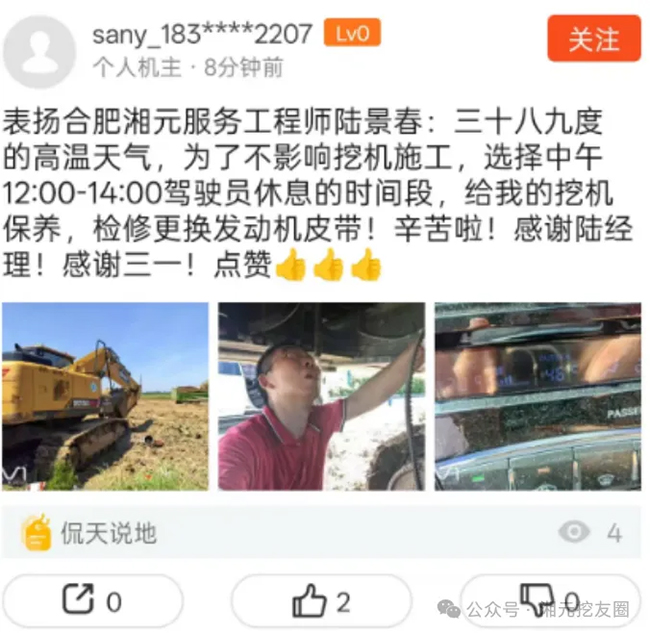 "表扬合肥湘元服务工程师陆景春:三十八九度的高温天气,为了不影响挖机施工选择中午12:00-14:00驾驶员休息的时间段,给我的挖机保养,检修更换发动机皮带!辛苦啦!感谢陆经理!感谢三一!点赞"。 程汉在易维讯里写下的这段话,道出了所有客户的心声。在最炎热的时段,别人躲着太阳走,陆景春却迎着烈日上—— 他用自己的汗水,换来了客户的安心;用正午时分的坚守,诠释了 "急客户所急,想客户所想" 的服务承诺。