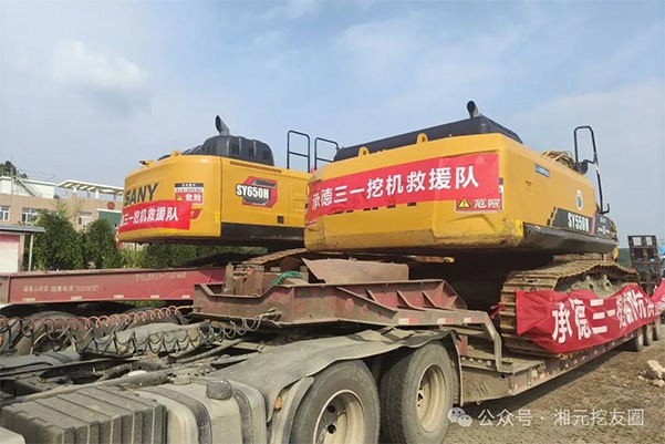 灾情就是命令! 三一重机第一时间启动应急救援机制,三一救援队火速集结,由工程师王超、张德亮带队,携挖掘机设备奔赴灾区。