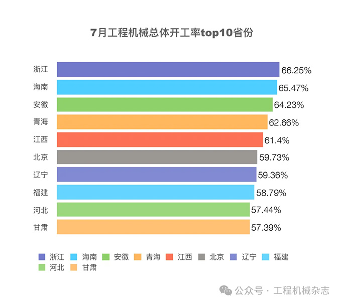 7月份,综合开工率排名前十的省份分别是:浙江、海南、安徽、青海、江西、北京、辽宁、福建、河北和甘肃。其中,全国共有20个省份开工率超过50%,全国各地基建项目发展均衡。