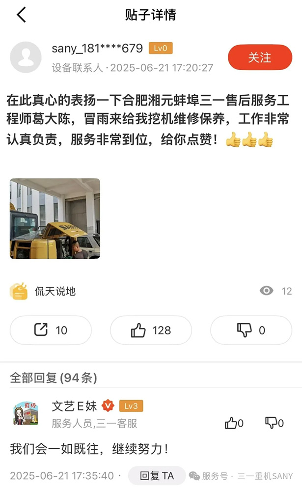 他们用实际行动诠释何为“客户至上,服务为本”,用专业和守信,守护客户的每一份托付。无论晴雨,无论昼夜,三一服务始终守护在您身边。因为我们深信:最好的服务,是承诺,更是行动!