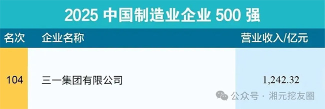 9月20日,中国企业联合会、中国企业家协会在2025世界制造业大会开幕式上发布了2025中国制造业企业500强榜单,三一集团荣列第104位,稳居工程机械行业第一。这是中国企联连续第21次向社会发布该项榜单。大会指出,2024年,全球经济面临多重挑战,中国经济运行总体平稳,稳中有进。以500强为代表的中国制造业大企业,以创新突破应对挑战,以结构优化夯实根基,整体发展呈现支撑地位保持稳固、收入规模基本稳定、经济效益降幅收窄、创新动能不断增强、产业结构持续优化、出口韧性稳步提升等特征。
